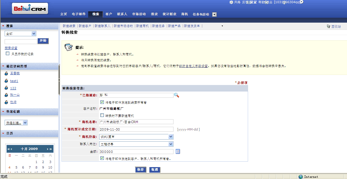 > 通过在线获得的线索信息将线索推动到下一个阶段,一旦线索满足预期的条件,单击鼠标即可转换到商机或客户