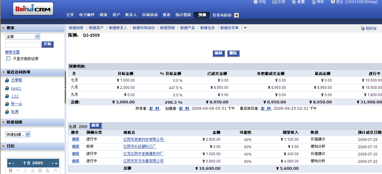 | 线索管理 | 销售机会跟踪 | 客户管理 | 联系人管理 | 销售任务&活动跟踪 | 销售目标 | 销售预测 |